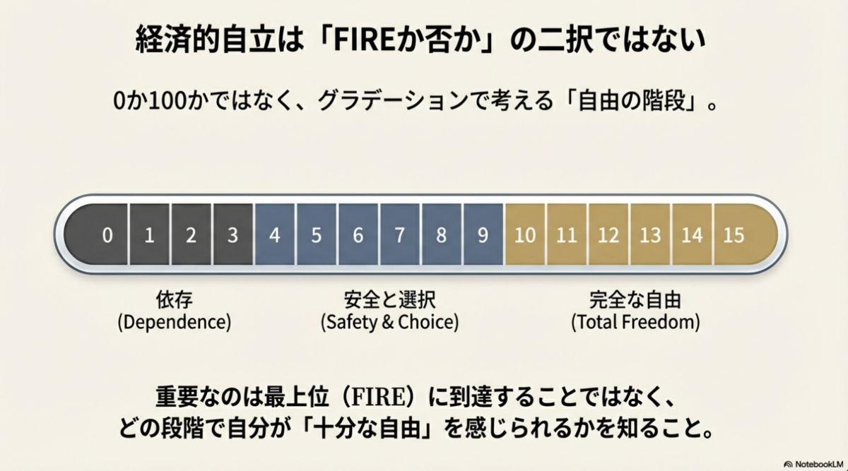 むしろ、FIREに至るまでの「途中段階にも十分な価値がある」ことを可視化するための考え方です。