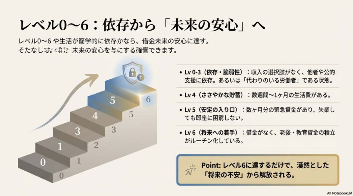 | 5 | 安定の入り口 | 数ヶ月分の生活費(緊急資金)があり、失業しても即座に路頭に迷わない。 |