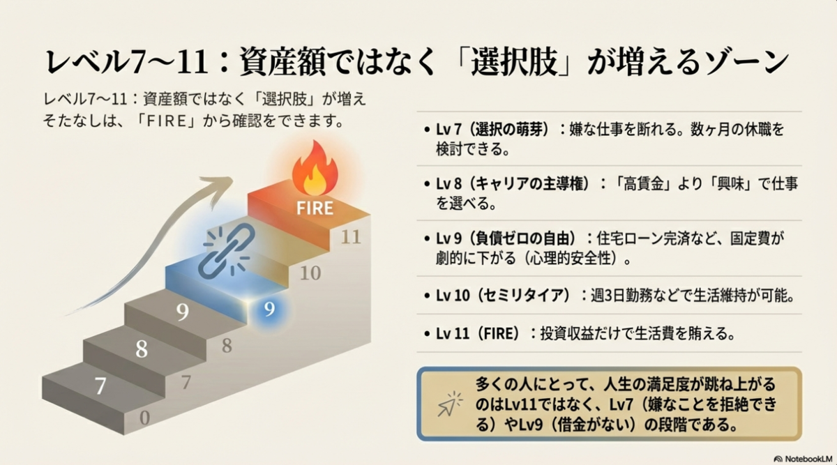 この水準であれば、完全FIREには届かなくとも、レベル9〜10の「負債に縛られず、働き方を選べる状態」には十分到達可能です。