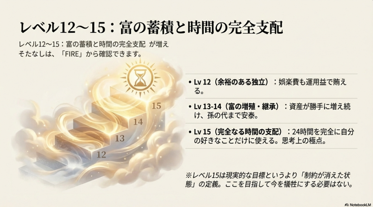 なお、レベル15は現実的な到達目標というよりも、「制約が限りなく小さくなった状態」を示す思考上の極点として捉えるのが適切でしょう。