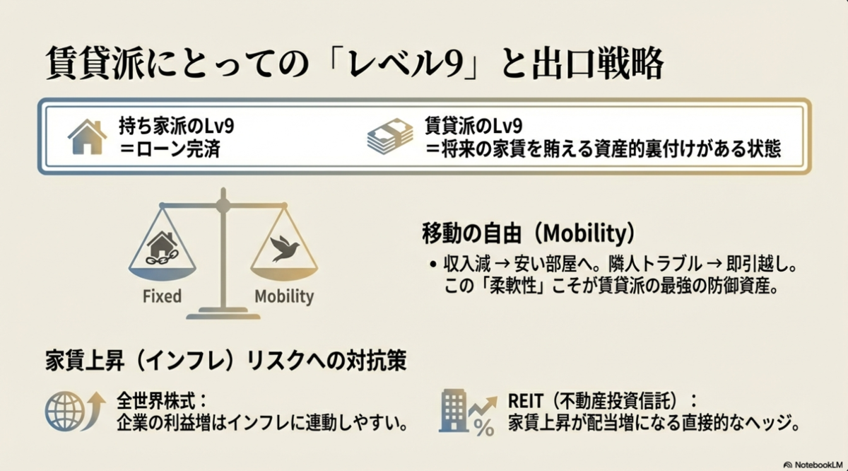 持ち家派のレベル9は「住宅ローン完済」ですが、賃貸派の場合は「将来の家賃支払いを長期的に支えられる資産的裏付け」がポイントになります。賃貸の場合、レベル9は「負債ゼロ」に加え、「家賃の支払いが将来にわたって家計を脅かさない確信」を得る段階です。