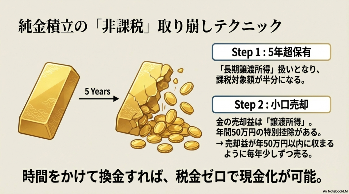 つまり、年間の譲渡益が50万円以内に収まる範囲で売却すれば、非課税で取り崩すことが可能です。特に長期保有の場合は、譲渡益が「(売却益−50万円)×1/2」で計算されるため、実際には50万円を超える売却でも非課税になるケースがあります。売却額ではなく「譲渡益ベース」で調整することが重要です。例えば500万円分の金を保有しているなら、10年かけて少しずつ換金すれば税金をゼロにできます。