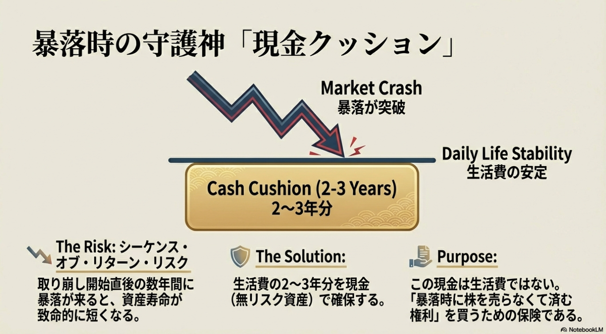 運用終盤や取り崩し初期の暴落は、積立期の暴落よりも家計に深い傷跡を残します。だからこそ、この現金は単なる「生活費」や「リターンを生む資産」ではなく、「売らない自由を買うための保険」と考えてみてはいかがでしょうか。