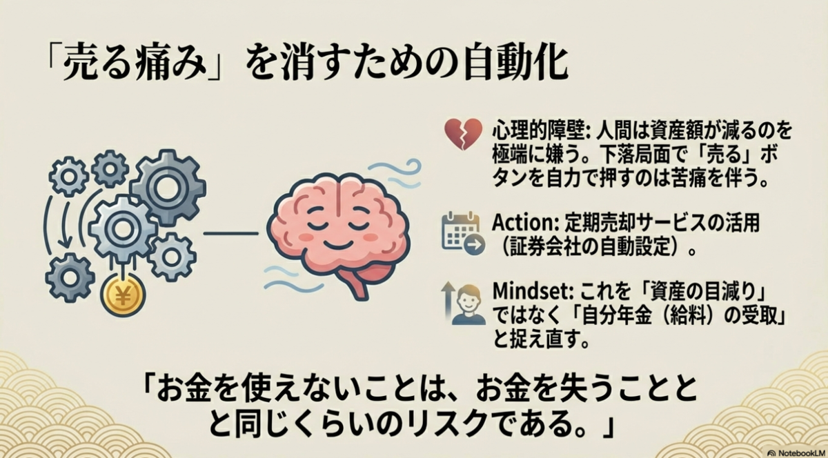 自分の手で売却ボタンを押すのは痛みを伴います。特に下落局面では、感情が判断を狂わせがちです。 証券会社の定期売却サービスを使い、「勝手に入金される仕組み」にして、それを給料と捉え直すと、取り崩しが安定します。