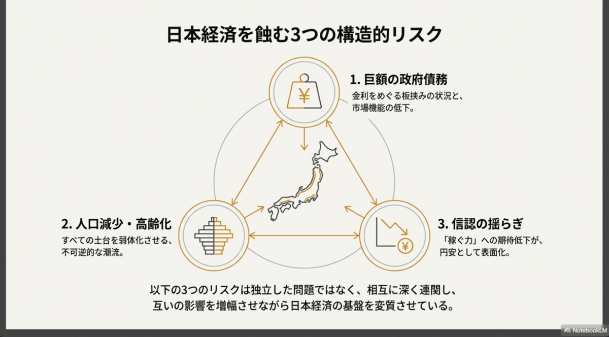 日本経済の持続可能性を考える上で、避けて通れない3つの構造的リスクが存在します。それは「巨額の政府債務」「人口減少・高齢化」「円安が映し出す信認の揺らぎ」です。これらのリスクはそれぞれ独立した問題ではなく、相互に深く連関し、互いの影響を増幅させながら、日本経済の基盤を静かに変質させています。本章では、これらの複合的な課題を一つずつ解き明かしていきます。