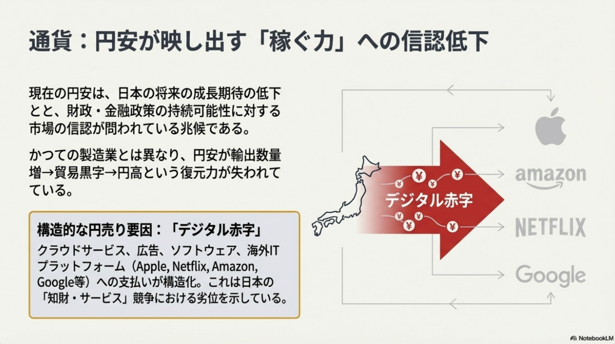 円安が是正されにくい背景には、貿易構造の変質に加え、拡大を続ける「デジタル赤字」の存在があります。円安の構造的要因になっているクラウドサービス、広告、ソフトウェアライセンス、海外ITプラットフォーム(例:iPhone(Apple)、Netflix、Amazon、Google広告など)への支払いは構造化されており、かつての製造業のように円安が輸出数量の増加を招き、貿易黒字で通貨価値を押し戻すという復元力が失われています。これは、日本経済が「知財・サービス」の付加価値競争において劣位にあることを示す構造的な円売り要因です。