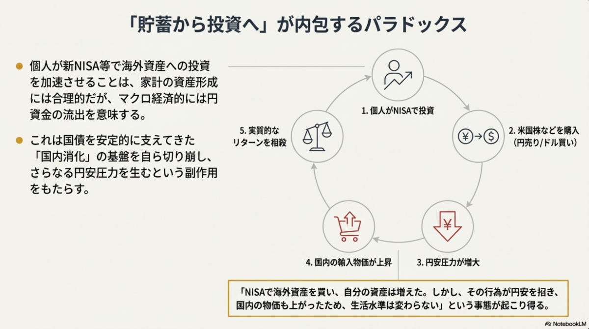 政府が推進する「資産運用立国」の方針も、マクロ経済的には二律背反(パラドックス)を内包しています。個人が新NISAなどを通じて海外資産への投資を加速させることは、家計の資産形成には合理的ですが、国内に滞留していた円資金が外貨へ流出することを意味します。量的に見れば長期的にじわじわ効く程度ですが、これまで国債を安定的に支えてきた「国内消化」の基盤を自ら切り崩し、皮肉にも国債暴落のリスクを高め、さらなる円安圧力を生むという副作用を(わずかながら)もたらしています。