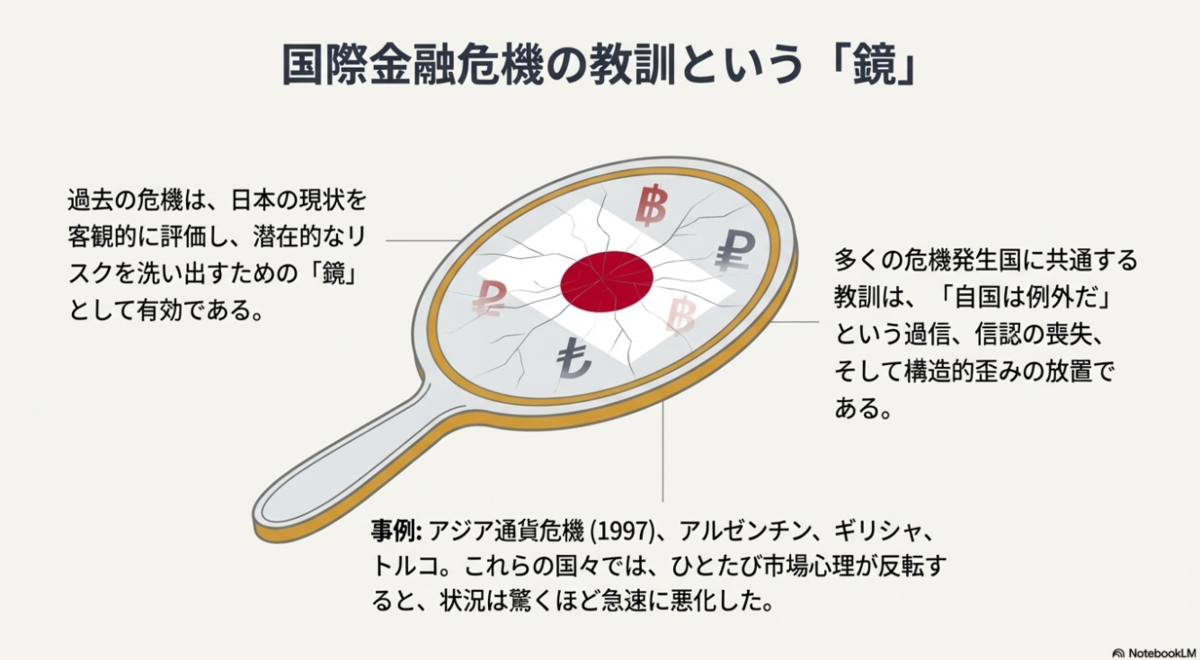 歴史を振り返ると、国際金融危機はそれぞれの国に固有の現象として発生しますが、その根底には「自国は例外だ」という過信、信認の喪失、そして構造的歪みの放置といった普遍的な教訓が共通して存在します。過去の事例は、日本の現状を客観的に評価し、潜在的なリスクを洗い出すための「鏡」として極めて有効です。これらの経験から学ぶことで、私たちは自らが立つ分岐点の意味をより深く理解することができます。