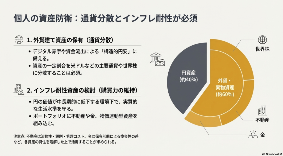 外貨建て資産の保有(通貨分散): デジタル赤字や資金流出による「構造的円安」に備え、資産の一定割合を米ドルなどの主要通貨や世界株に分散することは必須です。